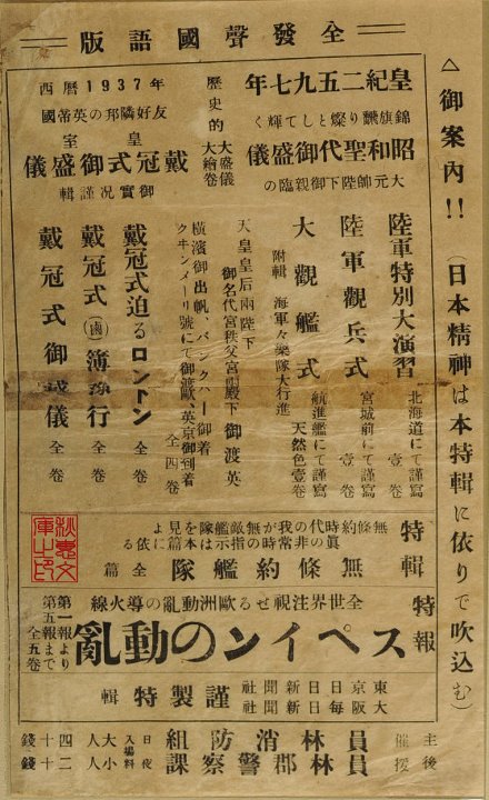 員林消防組合主辦的各主種灌輸日本軍國主義精神與世界重要時事報導的電影放映廣告單(1937)