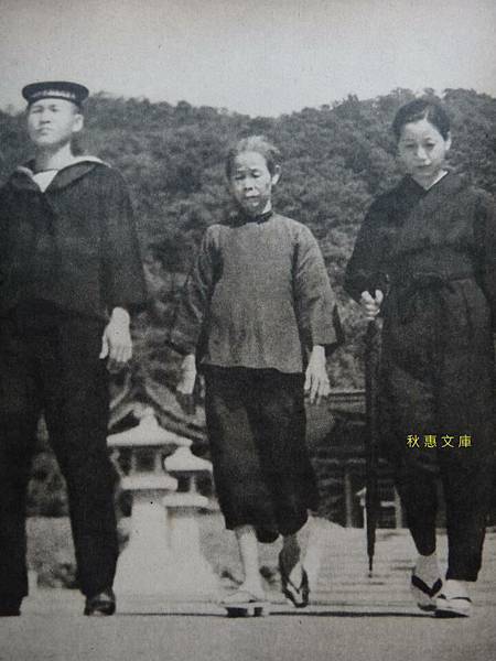 日本時代一位台灣海軍志願兵在入營訓練後第一次外出休假時與母親及新婚的妻子到護國神社參拜.