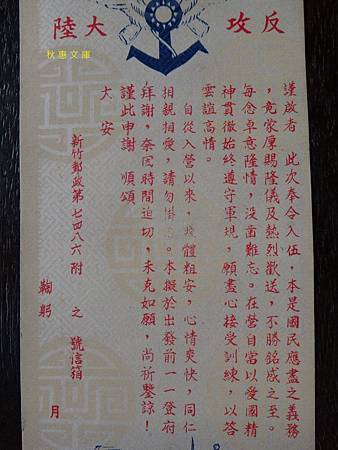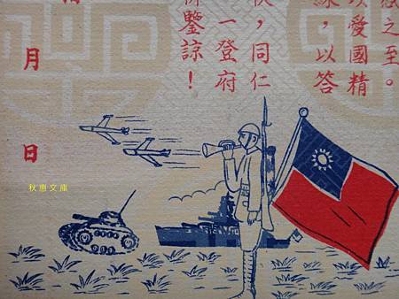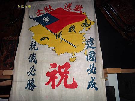 上圖: 歡送入營壯士旗 中圖:--我入伍之後賤体粗安,心情爽快,同仁相親相愛,在營願盡心接受訓練以答謝雲誼高情-----.民國50年代統一印製通知親友的反攻大陸入營卡片.