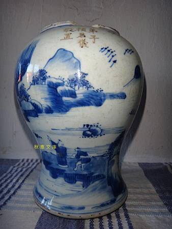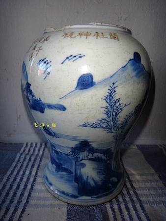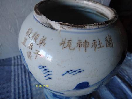 在青花瓷瓶上用釘子輕敲打刺字的平埔族神瓶