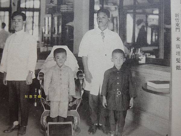大正7年(1918)來台於新竹東門附近開設末廣理髮店的上原盛保(相片右後)與小孩及助手合影,相片攝於昭和3年(1928)推算起來二位小孩也都是灣生吧!