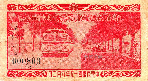 民國45年8月台灣省公路局成立十週年紀念日乘車贈獎券